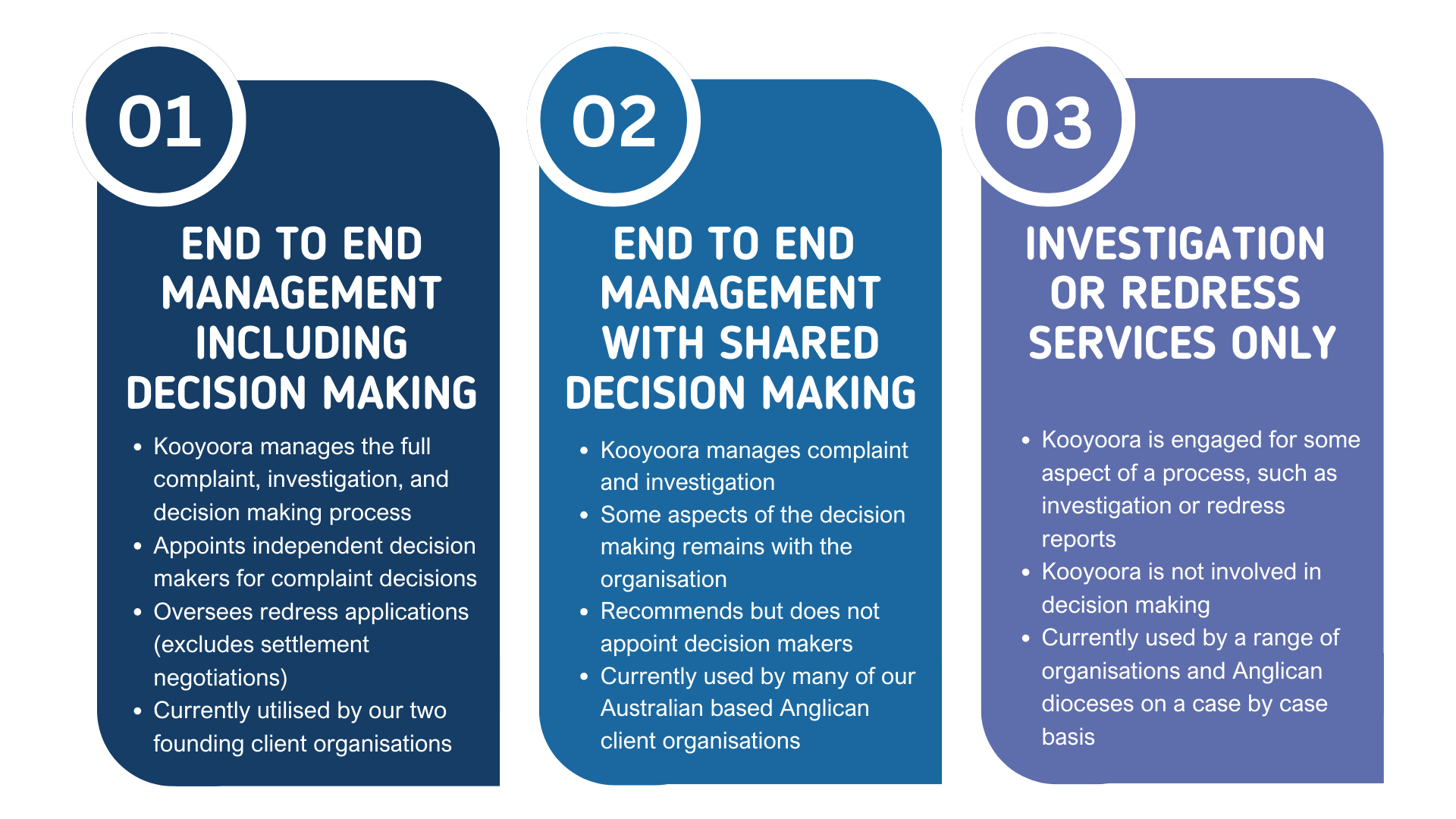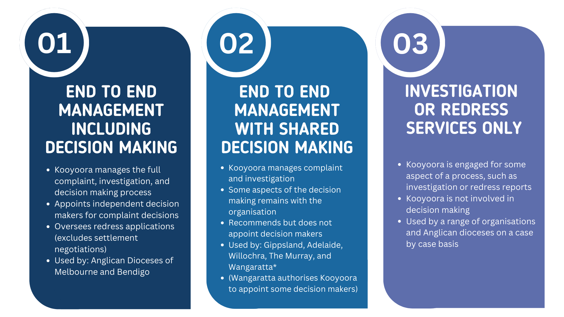 Kooyoora delivers professional standards services to the organisations we work with. The arrangements reflect a continuum of independence from fully independent managed services, including decision making, to contractual and discrete pieces of independent service delivery.